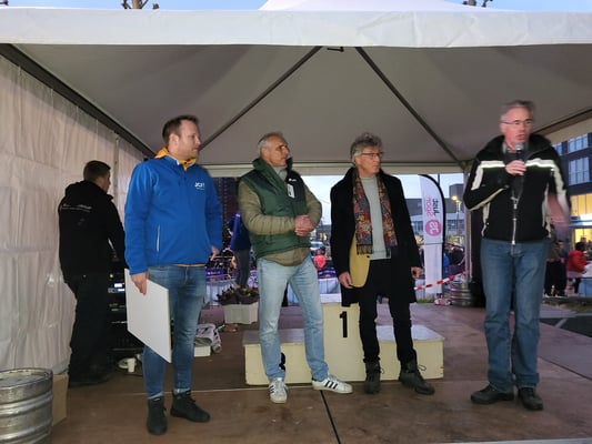 Op het stadsplein kon de penningmeester Richard den Bak (midden) een mooie cheque van € 6.000 in ontvangst nemen uit handen van de hoofdsponsors Cas Verhage (rechts, NH1816) en Arjan Broer (links, Veldsink-Van het Riet).
